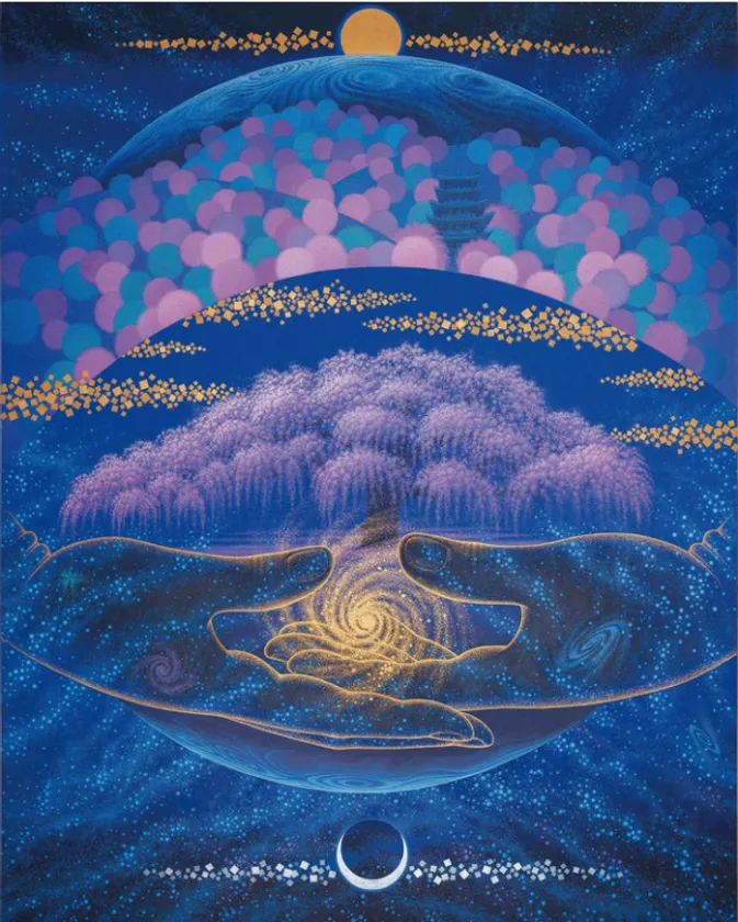 私が想像したのは、多くの人々が桜を愛で慈しむ心の中で仏の御手に懐かれた桜の古木は、満開と咲き誇り、銀河とともに宇宙の果てまで広がるように復活するのです。