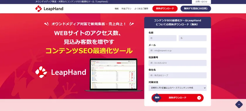 SEO対策やMEO対策をはじめ、WEBマーケティング全般をサポートする株式会社リープが、2022年11月16日(水)よりコンテンツSEO最適化ツール「LeapHand(リープハンド)」にて、無料デモ利用プランを新たに開設します。