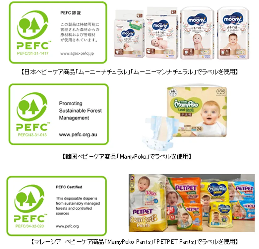 これまでに、PEFC「CoC認証」を取得し獲得した工場で生産した商品のうち、日本の「ムーニーナチュラル」「ムーニーマンナチュラル」、マレーシアの「MamyPoko Pants」「PETPET Pants」などの赤ちゃん用紙おむつにおいてパッケージに「PEFC認証ラベル」を掲載しています。