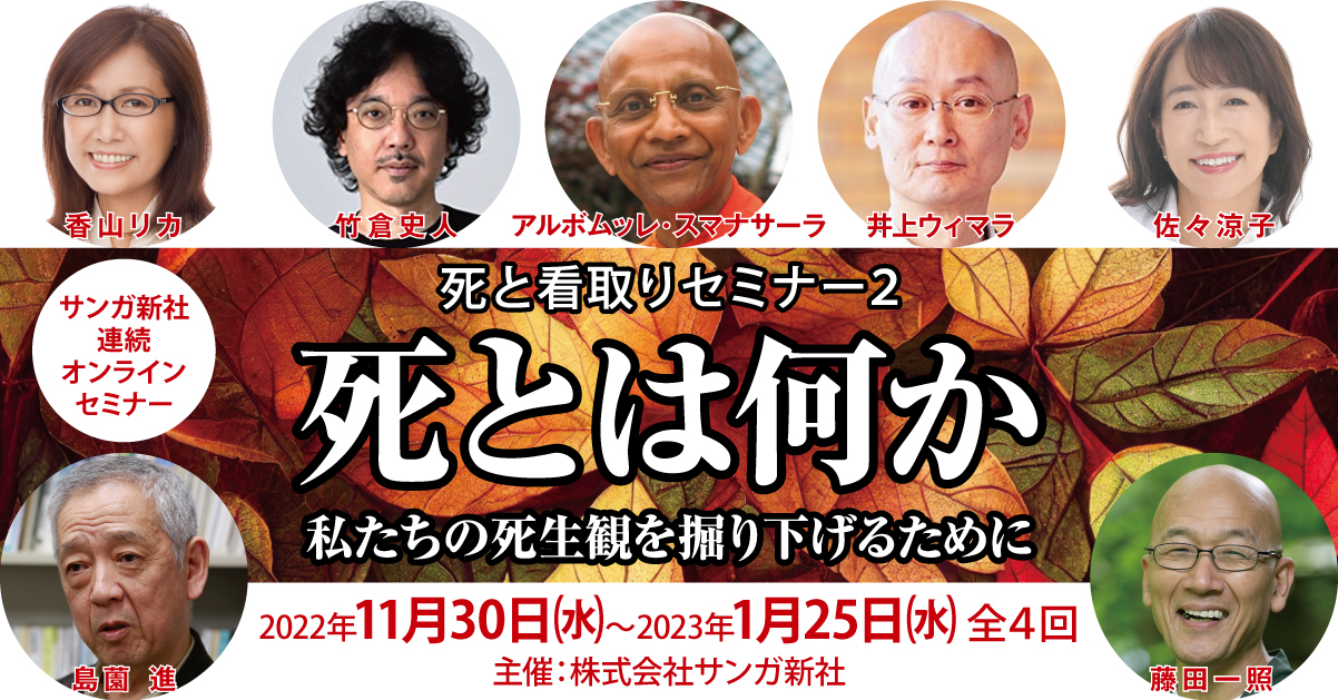仏教とマインドフルネスを中心に出版活動をする株式会社サンガ新社(所在地:宮城県仙台市、代表取締役:佐藤由樹)は、「私たち一人ひとりの死と看取り」を考える連続オンラインセミナー第2弾を、作家、研究者、僧侶の方々にご登壇いただき、2022年11月30日(水)~2023年1月25日(水)に全4回開催します。