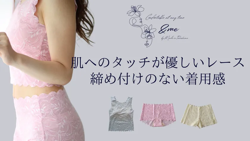 鼠径部をなるべく圧迫しない、「ふんどしパンツ」、吸水性機能がついた「サニタリーショーツ」、ナイトブラが流行る中で身体への圧迫が苦手という方へ向けたインナーとしてもナイトウエアでも使用可能な「トップス」等の商品を製作し、またコラーゲンを配合した特殊のレースをすべて使用し、肌にレースが触れてもチクチクを感じにくいものとなっています。
