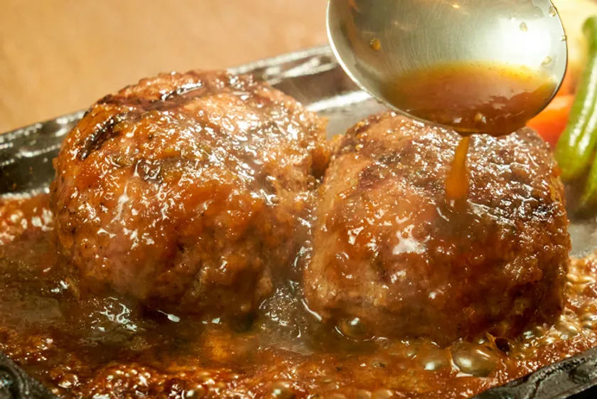 ハンバーグはお客様の目の前でカットすることでライブ感を演出。アツアツの鉄板の上でソースをかけるとジュワーッと音が立ち、香ばしい匂いが食欲をそそります。ミンチに合うよう3種類のオリジナルソースを開発。細部へのこだわりが五感すべてを刺激します。