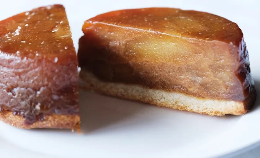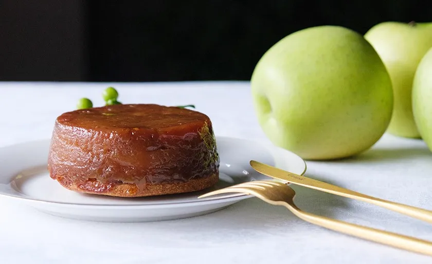 下層はサクサクしたクランブル生地を敷き詰め、上層はじっくりと時間をかけて煮詰めた滑らかな口当たりのりんごを何層にもぎっしり重ねることで、直径約9センチという小さめのホールケーキでもボリュームがある贅沢なタルトタタンに仕上げた。2~4人で分けて食べてもデザートとして十分に食べ応えがある。