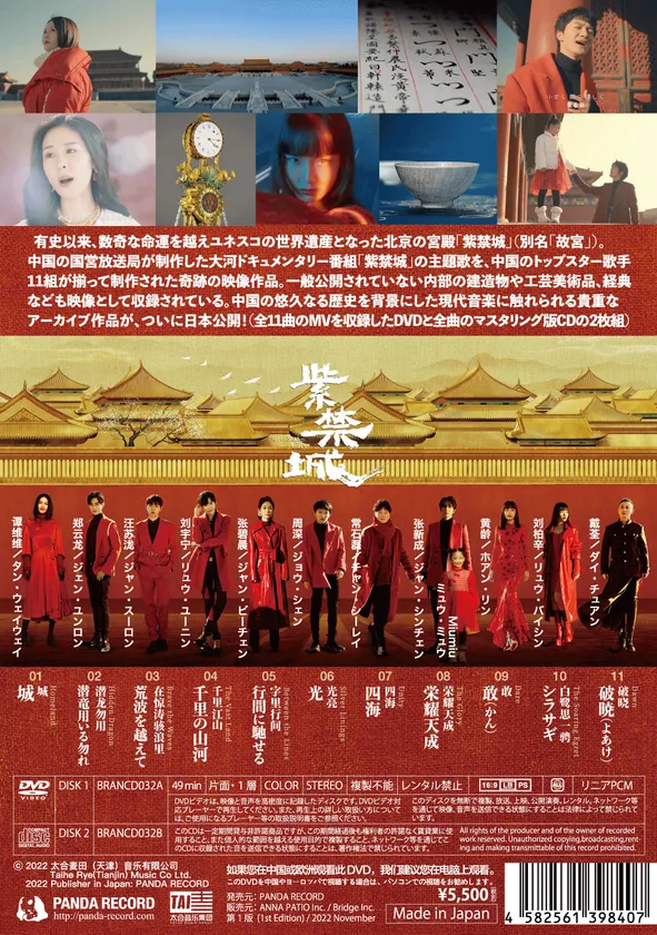 中国のアーティストを日本からリリースする音楽レーベル PANDA RECORDと中国最大手の音楽会社 太合音楽集団は、「紫禁城」のDVDとCD(2枚組)を、日本全国の主要CD店舗やインターネットショップで2022年11月30日(水)に一斉販売開始します。