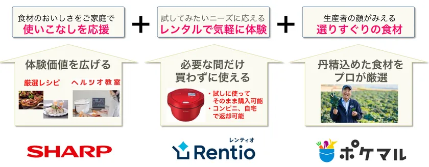シャープ株式会社(本社:大阪府堺市、代表取締役社長 兼 CEO:呉柏勲、以下:シャープ)と家電のサブスク・レンタルサービス「レンティオ」を提供するレンティオ株式会社(本社:東京都品川区、代表取締役社長:三輪謙二朗、以下:レンティオ)、国内最大級の産直アプリ「ポケットマルシェ」を運営する株式会社雨風太陽(本社:岩手県花巻市、代表取締役:高橋博之、以下:雨風太陽)の3社は、シャープの水なし自動調理鍋「ヘルシオ ホットクック」のレンタルに加え、ホットクックで調理できる厳選された食材やレシピ、料理教室を連携させ、継続的に健康調理をお楽しみいただける新たなサブスクリプションサービスの実証実験を、本年12月1日に開始します。