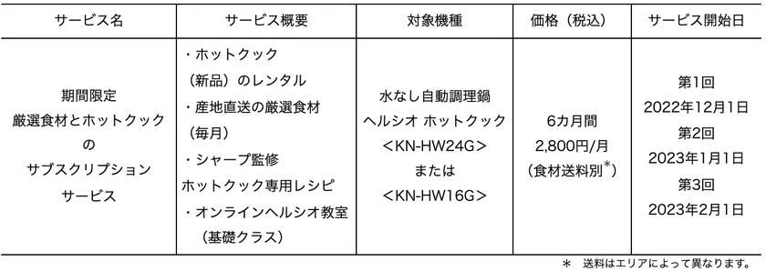 今回、これら2つのサービスを進化させ、ホットクックの機器レンタルや期間中毎月お届けする厳選した産直食材、食材に適したホットクック専用レシピの提案、シャープのオンラインヘルシオ教室の4点をセットにした新サービスを開発。本日11月11日より11月25日まで※1「ポケットマルシェ」の専用サイト( https://poke-m.com/stories/2259 )にて第1回の申し込みを受け付けます※2。