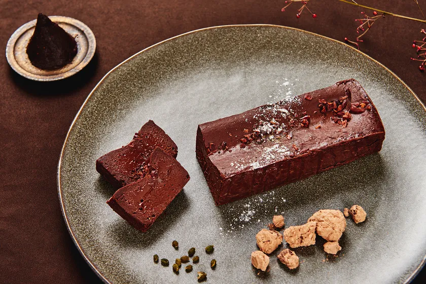 予約困難な店として知られるフランス料理店「Sincere」。その哲学と世界観が詰まった「アマゾンカカオのテリーヌ」。チョコレートではなくカカオそのものから作り、カカオの魅力を最大限に生かしたフルーティな酸味と芳醇な香りのテリーヌに仕上げています。