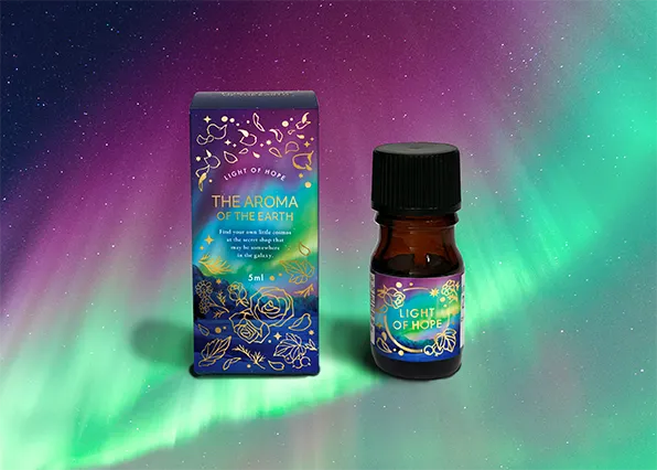 ”天の川の香り”の紅茶や、隕石のキャンドル、星屑のきらめきを詰めたネイルカラーなど、美しく、宇宙でここだけのアイテムが並ぶ。