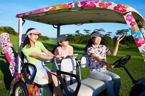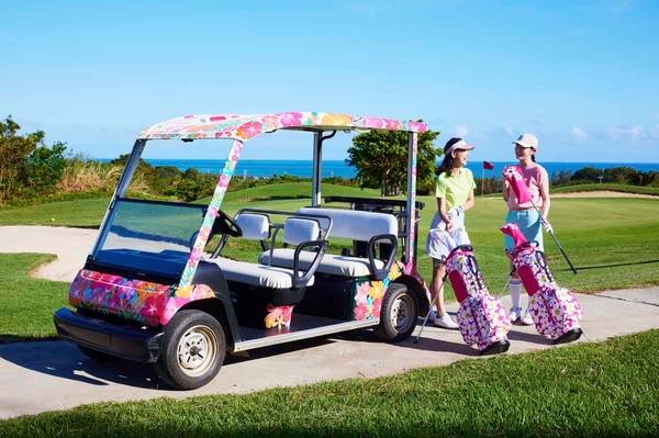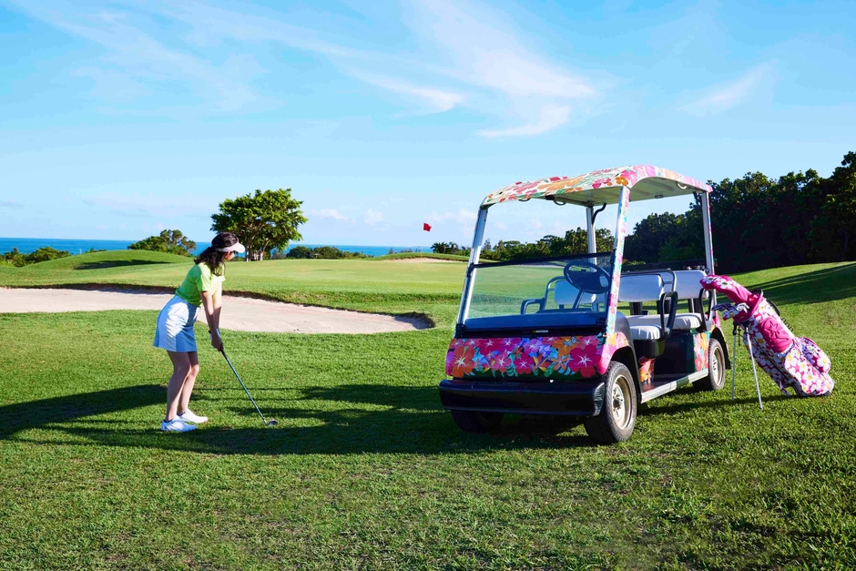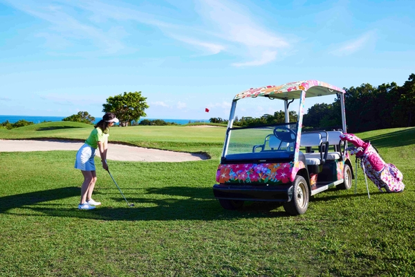 南国カラーのハイビスカスを施したゴルフカートでプレーします。クラブバッグやグローブなども花柄で用意。ゴルフを始めたいけれど、グッズをどう選んだら良いのか分からないという方でも手ぶらでゴルフプレーを楽しむことができます。