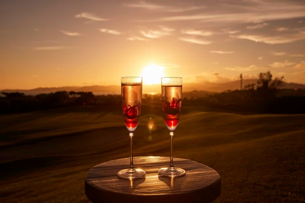 最終ホールでのプレー終了後に、「夕暮れフラワーシャンパン」で乾杯します。グラスにトッピングフラワーを入れ、シャンパンを注ぐと、グラスに花が咲いたようにローゼルが立ち上がる、見た目も華やかなドリンクです。刻々と表情を変える絶景の中、爽やかで甘酸っぱい味わいを堪能できます。
