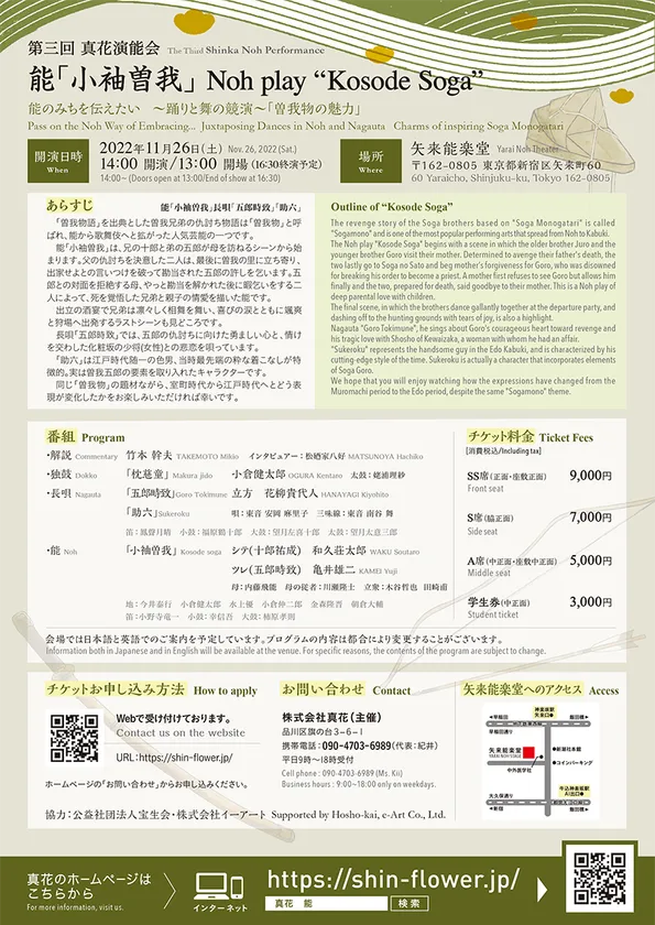 *今回の演能会の演目は、室町時代に発祥した能楽、江戸時代に花開いた歌舞伎の音楽である長唄と舞踊で構成されています。異なる二つの伝統芸能を組み合わせるという初の試みにより、同じルーツをもつ題材としての曽我兄弟の仇討ちが一層興味深く受け止められ、幅広い感動を与えるものと願っています。