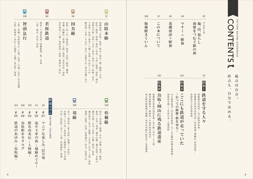 鳥取県内全駅+兵庫・岡山の52駅を加えた、全130駅を取材。路線・駅ごとに、写真と紹介文で1駅1駅を丁寧に取り上げています。