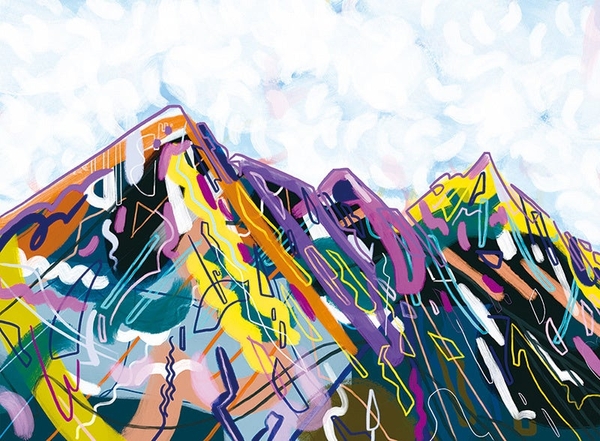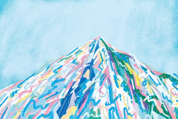 天候や山のフォルム、時間帯でさまざまな表情を魅せる山に惹かれ、山になるまでの、大地が蓄積していく過程を表現するために、意図せずに書き連ねた面と線画の積み重なりを、空との境目で山のフォルムに仕上げていく工程で描いています。