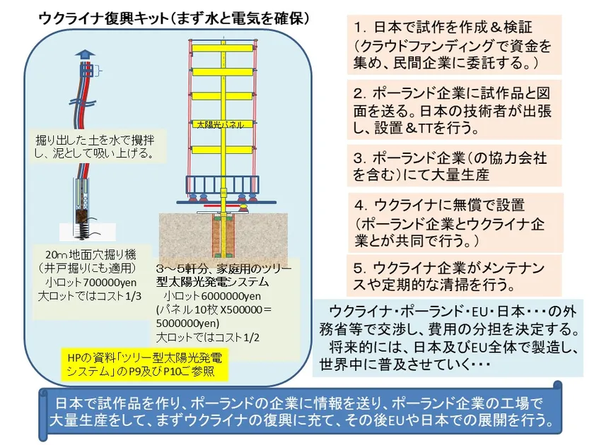 *ロシアによるウクライナ侵攻では、多くの水道施設が破壊されました。また大型地震等で、国内でも水道が使えなくなるという事態がしばしば発生しますが、UV-LEDによる水の消毒技術が確立したことで、もう一度井戸水に着目したいと考えています。→ドリルで地面に穴あけを行い、土砂を水で攪拌して、泥としてポンプで引き上げるシステムの試作品の開発を行います。(土砂が残存する場合は、ドリル部を引き上げて、土砂をかき出します。)