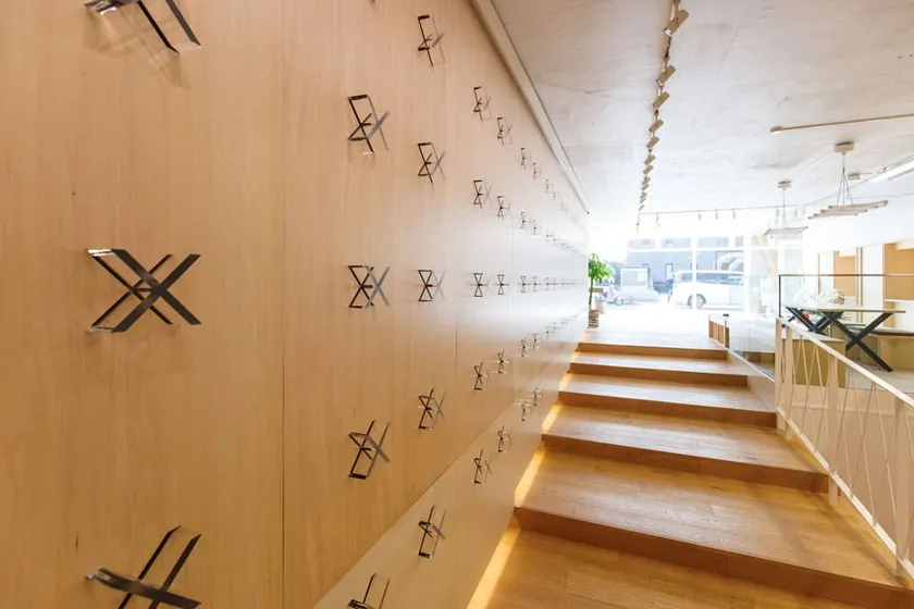 開放感と心地よさを感じるスペースの中に、大型デジタルサイネージ、インタラクティブディスプレイ、超短焦点プロジェクターが設置されており、簡単に、インタラクティブに、スタイリッシュに企業紹介・製品説明ができるエリアです。B1FにつながるスロープはUNITEXのシンボル“X”が並ぶ斬新なデザインとなっており来訪者を驚かせます。