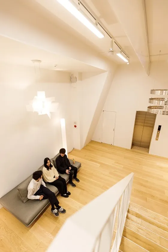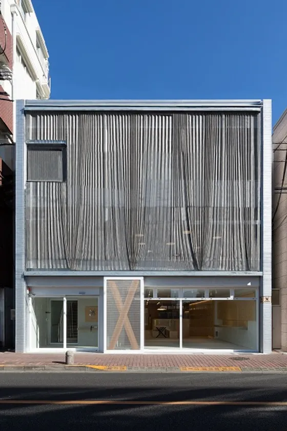 これまでの信頼と実績の上に、新しい世界を切り開きたいという社長の熱い思いを受けて、企業の新たな顔となる空間づくりを目指しました。磁気テープの曲線をイメージするドレープ状の金属メッシュを既存外壁に重ね合せ、温故知新の企業精神を体現しています。内部は既存機械式駐車場の大空間を活かして開放的な情報交流の場を築き、社の歴史と未来が体感できる、本社らしいオリジナリティのある空間となっています。この自由度の高い空間をスタッフの皆様が積極的に使いこなしていくことで、町田から世界へ向けて情報が発信されることを期待します。