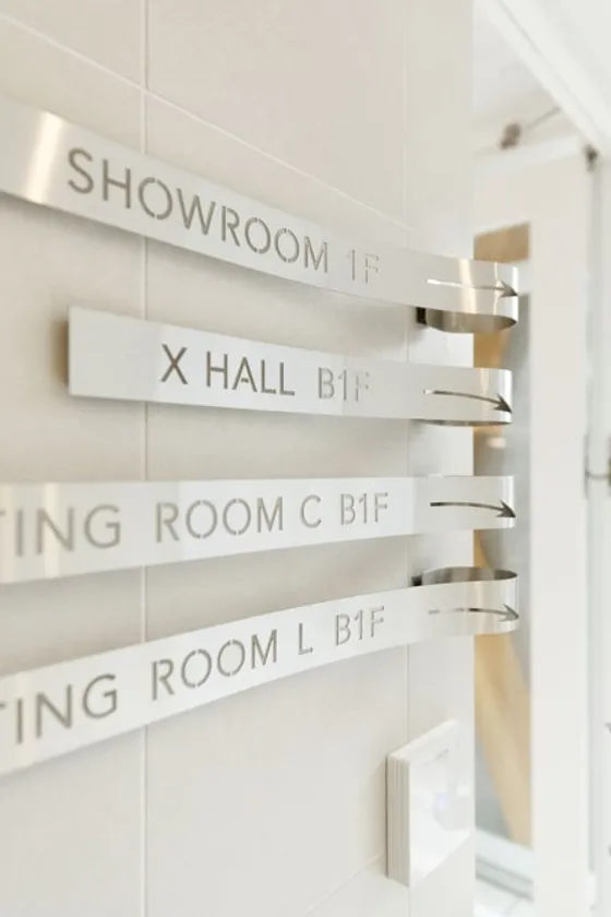 ユニテックスの商材である磁気テープメディアをイメージし、ステンレスの曲げ加工によって、各所にロゴマークや誘導サイン、室名サインを設置。エレベーターホールには、誘導サインとして、円形の形状による360°のアート性もあるサインを設置しています。