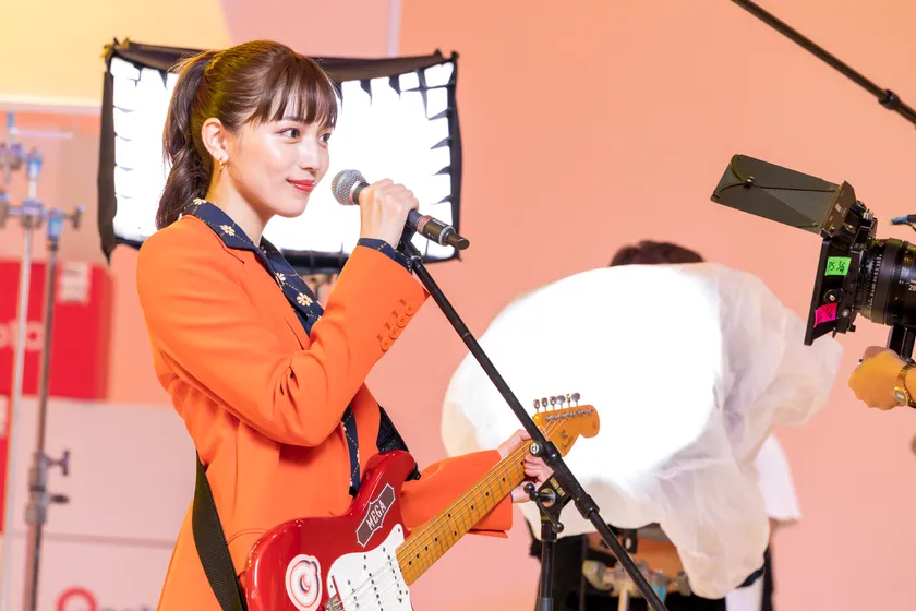 本TV-CM「MC」篇では、ドラムやキーボード、トランペットなど楽器ごとに各プレイヤーがキャスティングされ、あたかもライブ会場のようなセットが用意されました。そこに、オレンジ色のスーツ姿で川口春奈さんが登場。本格的に機材が用意された撮影環境に少し驚きながらも、生まれて初めて本物のギターを手に持つと、ワクワクした表情を浮かべていました。