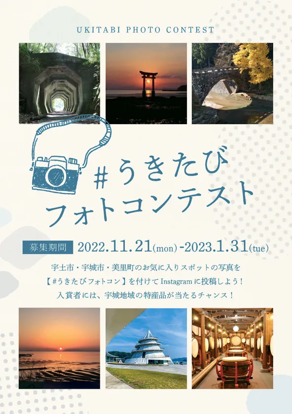 同時に、開催期間中の11月から1月の期間には、宇城地域の魅力を発信する「#うきたび フォトコンテスト」を開催し、投稿いただいたお客様の中から、宇土市・宇城市・美里町 3市町優秀賞に選ばれた方に対し、宇城地域の特産品詰め合わせ(約1万円分)を贈呈いたします。