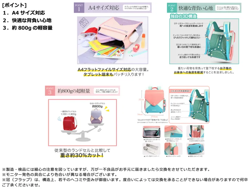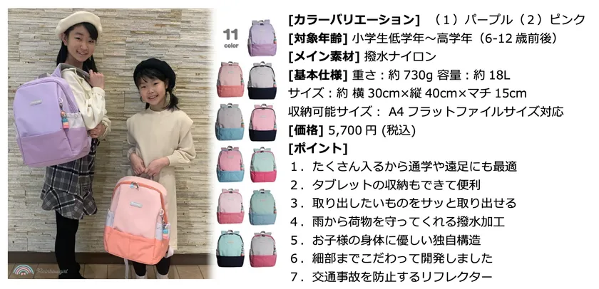 小学生の通学カバンに新しい選択肢を! デザインと機能性を追求した「なないろキッズリュック」など ランドセル型リュックが販売数6,000個を突破