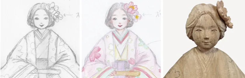この商品の為のオリジナル作品を依頼。伝統的な雛人形の意味は残しつつも、お客様が共感出来るような現代風なお顔と髪型を要望し、デッサンを元に、木を彫刻してもらいマスターモデルを作製しました。
