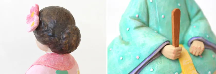 彫刻でしか出せない、着物の模様やしわなどの立体的な表現。色を何層にも塗り重ねることで作り出される、深みのある色彩と温もりのある雰囲気が魅力です。