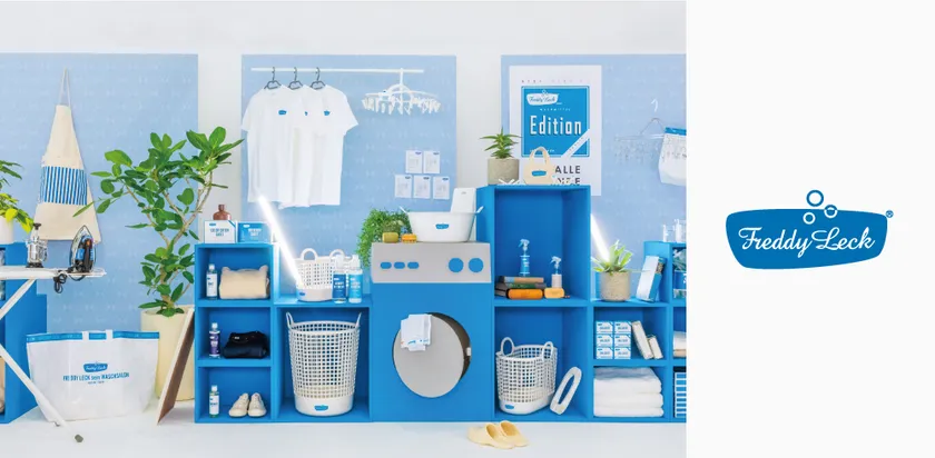 FREDDY LECK(フレディ レック)は、ベルリン北部にある運河に囲まれた町モアビットからはじまりました。オーナーのフレディ レックは、演劇を若い頃に勉強し、自分を何かで表現したいということと、洗濯というキレイにする行為なのにコインランドリー自体がキレイでないという矛盾を解決したいとして、コインランドリーとカフェがひとつになったウォッシュサロンを立ち上げました。その後、ユーザーのためにオリジナルの洗剤や柔軟剤をつくったことがきっかけで、サロンやお家で使えるランドリーグッズをスタートしました。どこか懐かしいウォッシュサロンの内装や、機能的なランドリーグッズには、アソビゴコロがあり使う人たちを楽しませてくれます。