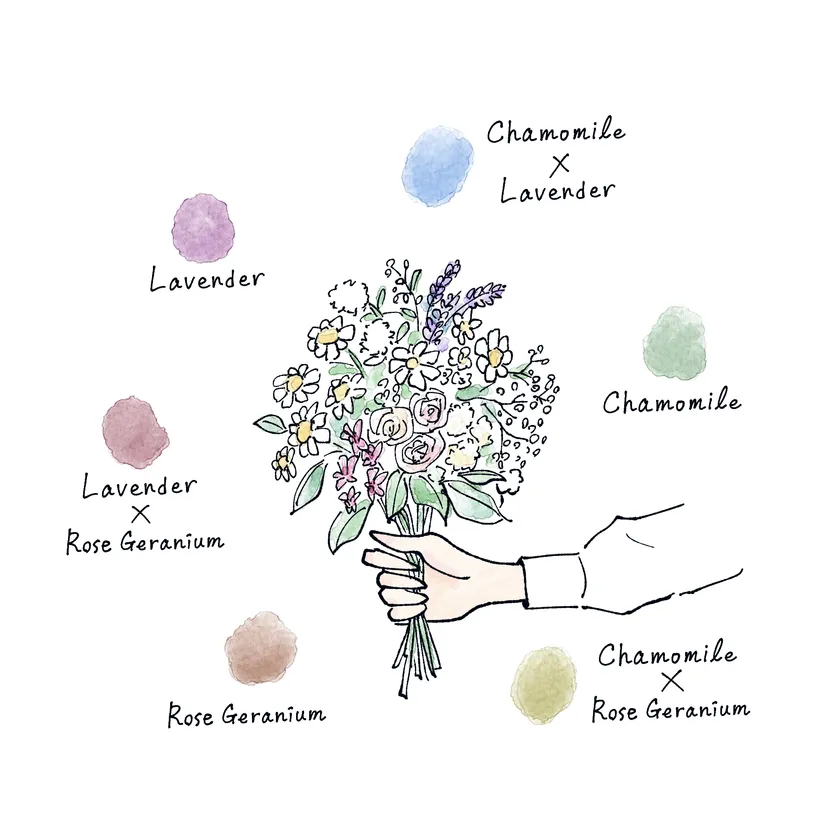 香りは、自然のお花をモチーフに天然精油を配合。微香タイプなので、外出時には匂いにくい仕様。3種の香りを、まるでアロマのように、その日の自分の気持ちに合わせてブレンドして楽しめます。少し疲れた日はラベンダーとカモミール、いいことがあった日は華やかなローズゼラニウムとカモミールなど。