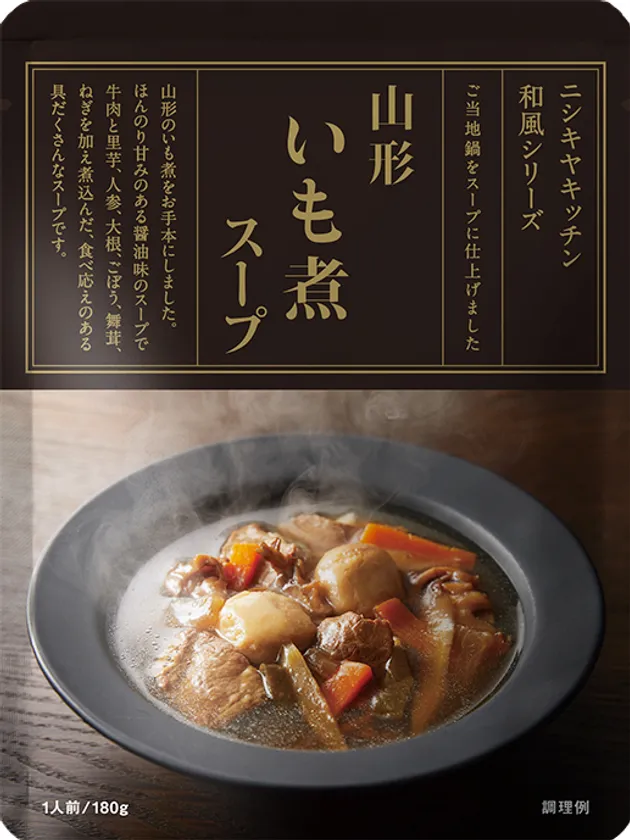 山形の郷土料理、いも煮をお手本にした具だくさんなスープです。ほんのりと甘みのある醤油味のスープで、さといも、にんじん、だいこん、牛肉、ごぼう、まいたけ、ねぎを煮込みました。【内容量180g 価格550円(税込)】