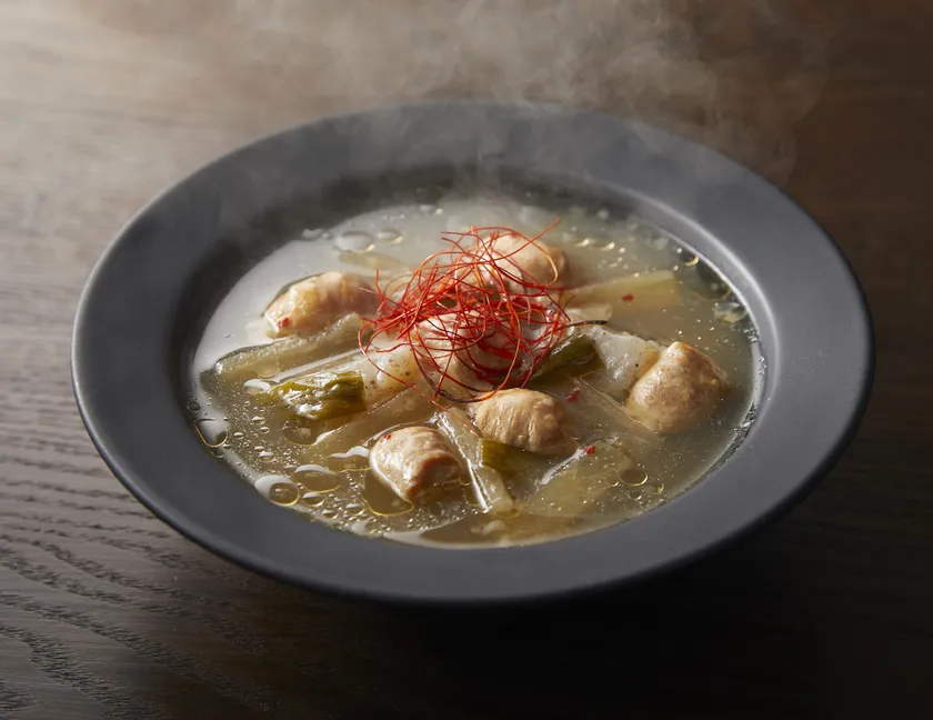 5種類の野菜がたっぷり。かつおぶしと昆布の旨みが溶け込んだスープを、国産ゆずで上品に香り付けしました。
