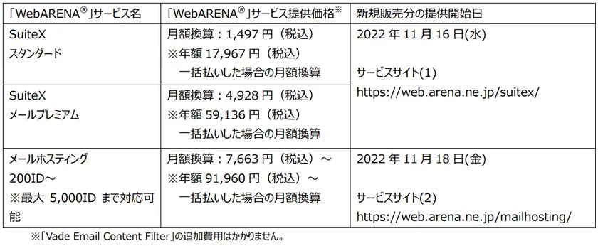 「WebARENA(R)」で「Vade Email Content Filter」を標準搭載するサービスは次の通りです。本機能は追加費用なしでご利用になれます。