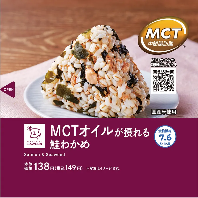 この度、株式会社ローソン(本社:東京都品川区、代表取締役社長:竹増 貞信、以下 ローソン)から、2022年11月15日(火)より、MCTオイルを配合した健康志向のおにぎり「MCTオイルが摂れる 鮭わかめおにぎり」149円(税込)が全国のローソン店舗にて発売されました。