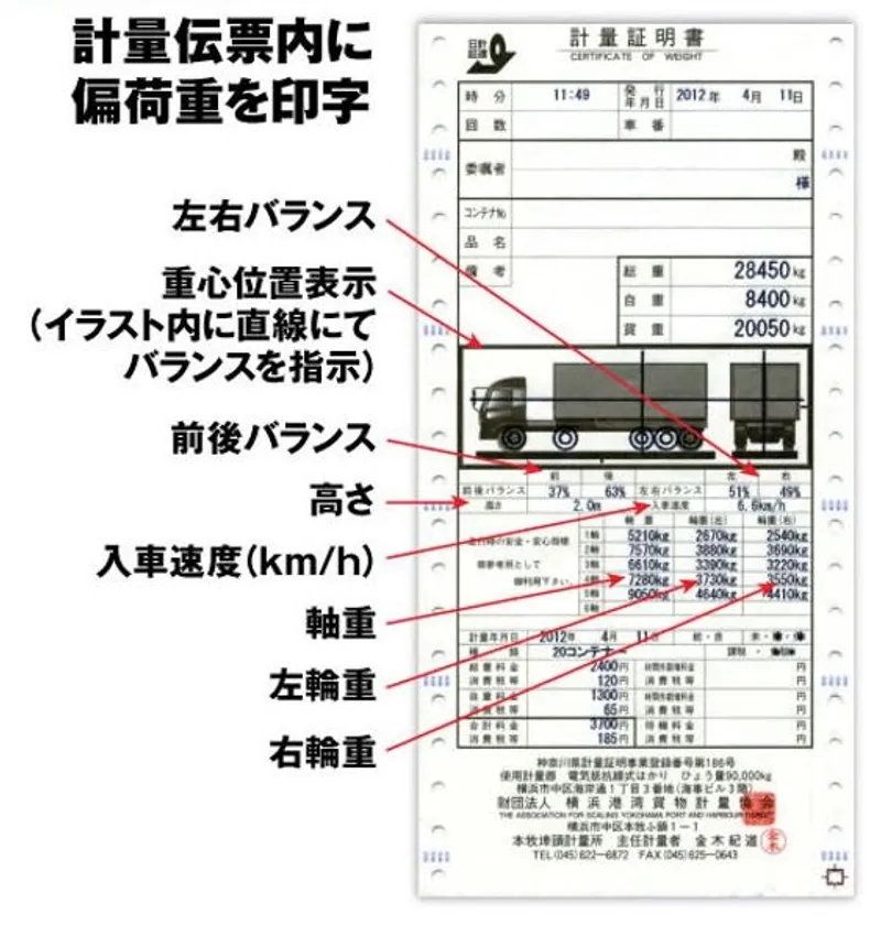 鎌長製衡の「サトルス」は車輌がトラックスケールに載るだけで開梱することなく積み荷の重心位置を三次元(前後、左右、高さ)で把握することができるため、危険性の高い車輌の発見に役立ちます。