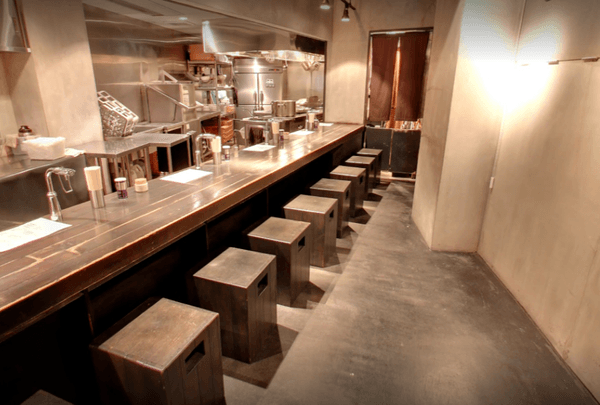 『俺の空 池袋店』の大きな特徴のひとつは「本当にここがラーメン屋さんなの?」と思わせる、おしゃれな佇まい。店内は黒色を基調としたクールな空間で、コンクリート打ちっぱなしに雰囲気いっぱいの木製テーブルと、まるでBarに来たような感覚になります。間接照明が心地良く、女性のお一人様やデートでも立ち寄りやすいお店ですよ。