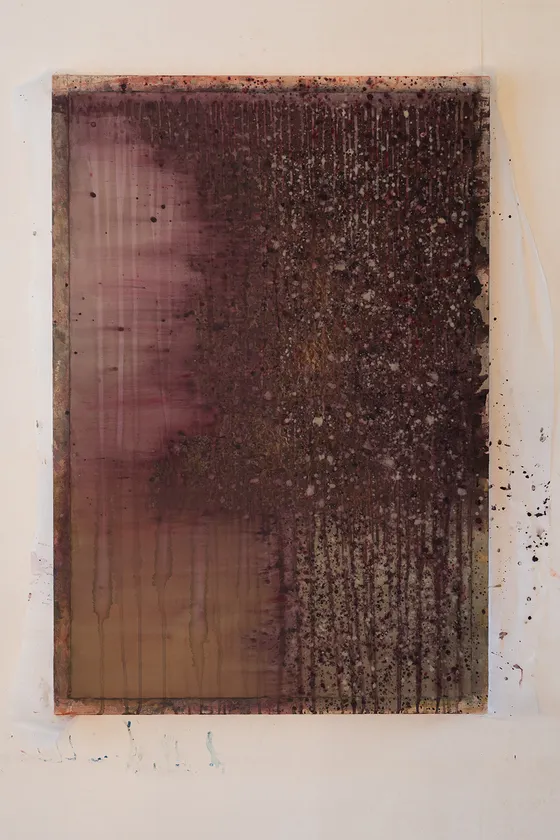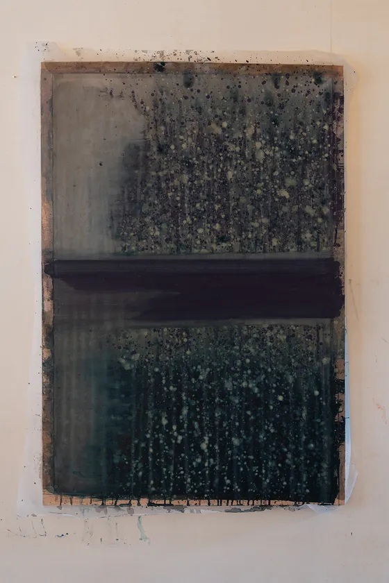 山田の作品に特徴的なのは、あたかも水が動きながら自ら描いたような表現だ。薄く溶いた膠が、画面の上を流れて垂れる。岩絵具の粒子が削れて下地を露出させて、艶を欠いた、枯淡な風合いの陰影があらわれる。絵の具を塗り重ねてゆく油彩画と違い、自然の采配や時間の経過を感じさせるこの技法は、観る者に作為や思考を手放させ、瞑想的な心地へと誘う。