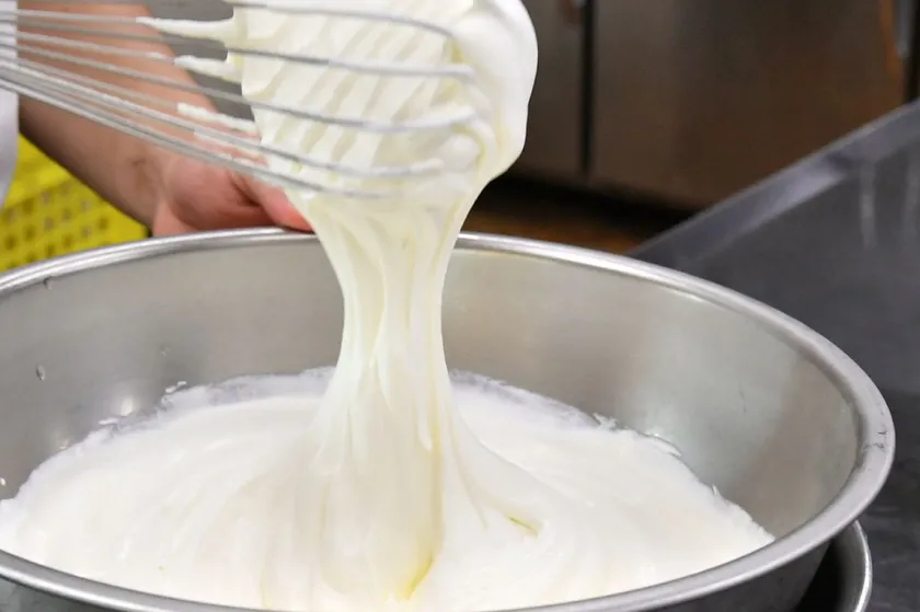 おかしめいとのバタークリームはふわっと香り高く軽い食感が特徴。加塩バターと食塩不使用バターを、塩味のバランスを考えて絶妙な分量で配合しています。さらに洋酒をたっぷりと使用。このかすかな塩味と香り高い洋酒が、あっさり軽い風味豊かなバタークリームの秘密です。