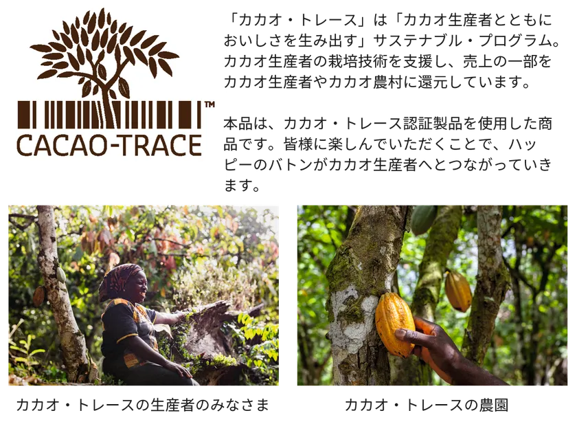 そこで今回はカカオ・トレースのチョコレートを採用しました。カカオ・トレースは生産者を経済的・技術的に守り未来に繋いでいくシステム。本商品ではお菓子で未来に笑顔を繋いでいきます。