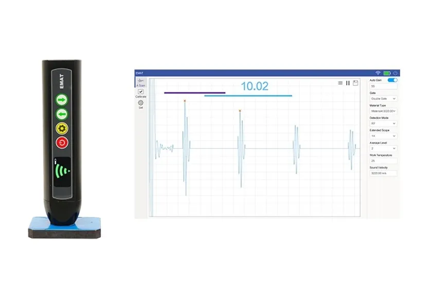 『MCT80』は、ポケットサイズの電磁超音波厚さ計です。Wi-FiでAndroidタブレットやWindows PCと接続し、リアルタイムでエコーを表示、感度やゲート、音速の調整が可能です。単体でも使用可能で、場所を選ばずどこでも厚さを測定することが出来ます。