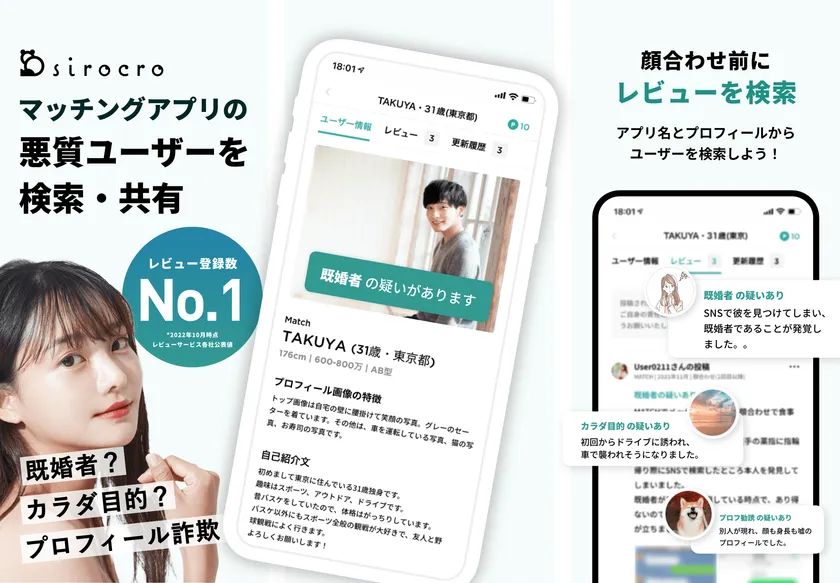 sirocroアプリをご利用頂くことで、マッチングアプリを利用するユーザーの中で、「体目的の既婚者」や「詐欺目的のビジネス勧誘」などの利用規約に違反する悪質なユーザーを検索・共有することができます。