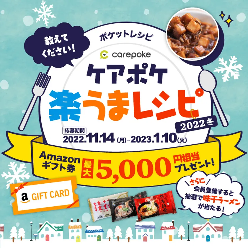 ケアポケ楽うまレシピ2022冬プレゼントキャンペーン開催! 公式Twitterをフォロー&引用RTして Amazonギフト券をゲットしよう!