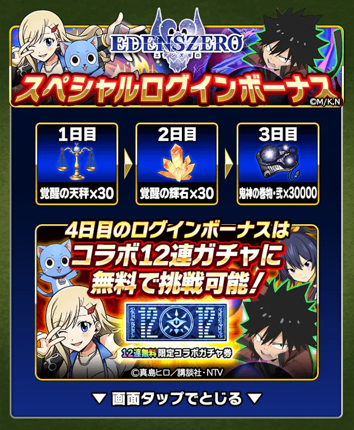 TVアニメ『EDENS ZERO』の人気キャラ「シキ・グランベル」「レベッカ&ハッピー」「ホムラ・コウゲツ」が獲得できるコラボ限定ガチャが登場します。