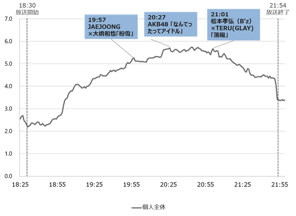 全世代に広く注目されたのは、20時前のJAEJOONGと大橋和也(なにわ男子)による「粉雪」でした。そこから生放送は続き、20:27にはAKB48が小泉今日子の名曲「なんてったってアイドル」を披露。個人全体で最高視聴率の5.7%を記録しました。21時過ぎにB’zの松本孝弘とGLAYのボーカル、TERUがコラボで披露した「落陽」も、同率1位で視聴率5.7%を記録しました。