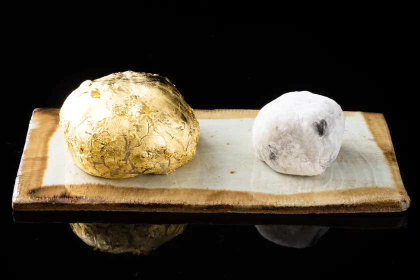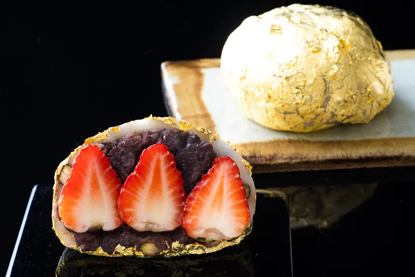 和菓子処 大角玉屋銀座店では、名物の元祖いちご豆大福を金箔で贅沢に包み、大福3個分のジャンボサイズに仕上げた「年末ジャンボちょーきん大福」を、1等・前後賞合わせて10億円が当たる年末ジャンボ宝くじの販売期間と同じ11月22日(火)~12月23日(金)まで、数量限定(1日5個)にてご提供いたします。