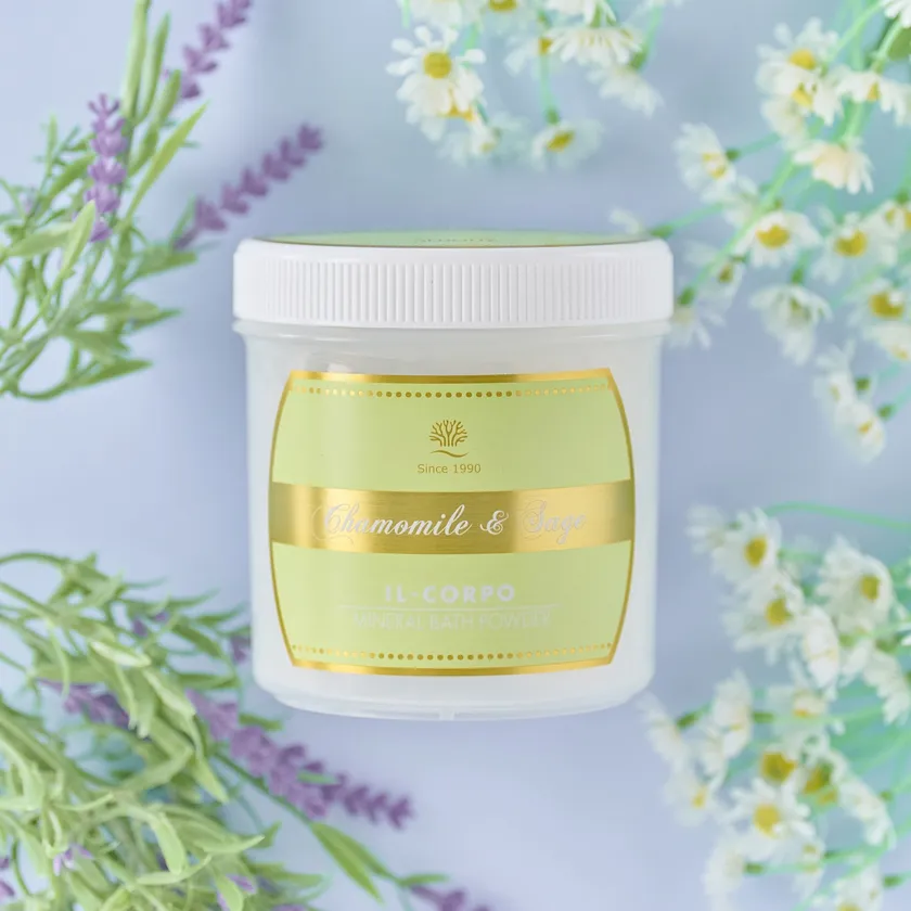 「ミネラルバスパウダーカモミール&セージ」は、自宅のお風呂を活用したボディケアを提唱しているイルコルポだからできること、入浴の効果を最大限に引き出すことで身も心も浄化し、心の中までホッと安心してほしい。そんな願いを込めて開発されました。