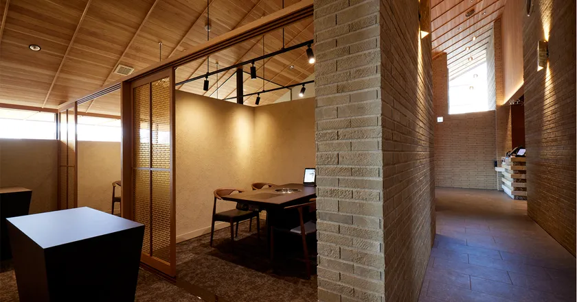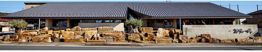 大きな屋根のもと「庭の中で食べる」が店舗の設計テーマです。庭には山を切り崩して採石した大きな恵那石(蛭川御影石)を客席に迫りあがるように配置しダイナミックな空間をつくりました。店舗内、中央の廊下は各個室へのプライバシーを高めるために列柱状の壁が立ち並び、壁面には土を原料とした岐阜県多治見産のタイルを貼ることで地層のような表情を醸し出しています。
