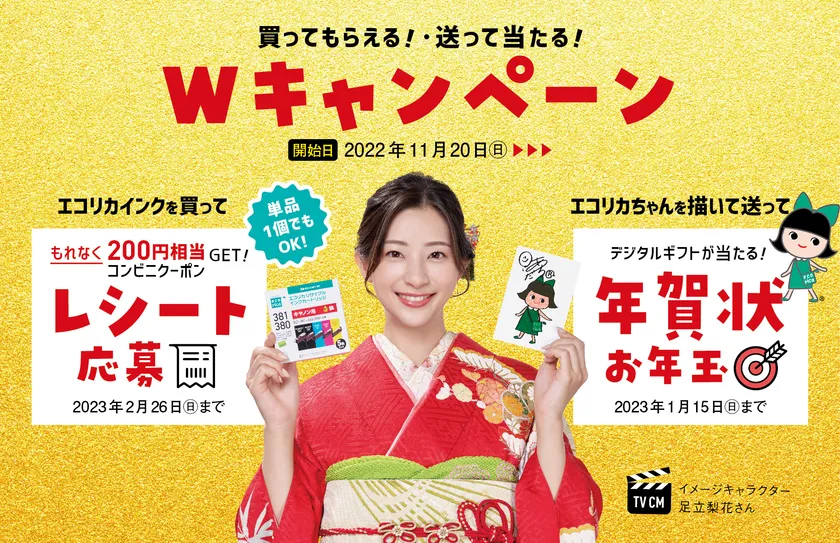 互換インクカートリッジシェアNo.1の株式会社エコリカ(本社:大阪市中央区、代表取締役社長:宗廣 宗三)は、2022年11月20日からエコリカリサイクルインクカートリッジを購入された方が参加できる『レシート応募キャンペーン』と、どなたでもご応募いただける『年賀状お年玉キャンペーン』の豪華Wキャンペーンを開始します。