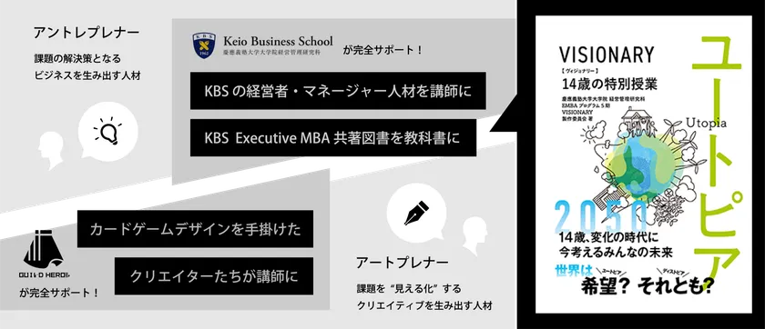 ギルドヒーローズ社は、慶應義塾大学大学院経営管理研究科(Keio Business School、以下 KBS)のExecutive MBA第7期生から生まれたスタートアップ企業です。このイノベーター育成プログラムでは、このKBSのExecutive MBAに在籍する多数のマネージャー・経営者人材を講師として招き、さらにはKBSのExecutive MBA第5期生が出版した共著「VISIONARY 14歳の特別授業」を教科書として活用。KBS現役学生・卒業生たちによる完全サポート体制の下、「アントレプレナー」の力を学びます。