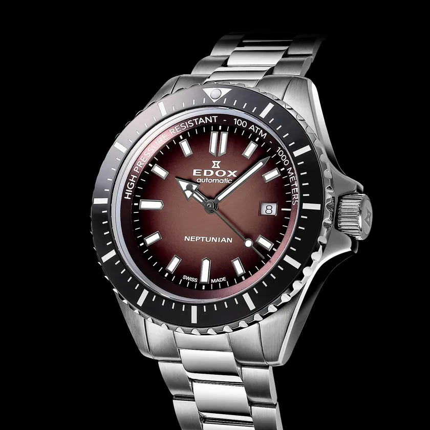 エドックスは、精鋭パラシュート部隊のために製造したアーカイブピースを、プロ仕様の高性能な造りとスタイリッシュなデザインで現代風に再解釈した『スカイダイバー ネプチュニアン オートマティック』を2021年に発表しました。性能面では、スカイダイバーコレクションでは初となる、開発コンセプトにふさわしい飽和潜水1,000m防水を実現。逆回転防止ハイテクセラミックベゼルと3mmの厚さを持つサファイアクリスタルが時計の表面を保護。ムーブメントは、高精度なスイス製EDOXキャリバー80を搭載。現代風のアレンジとして、スマートな印象を与えるバータイプのインデックスとアロー(矢印)ハンドの時針、ペンシルハンドの分針、先端近くにドットのある秒針を採用し、スーパールミノバ「X1」を塗布することにより水中など暗所での判読性を確保。また、ケースバックには、海の神ネプチューンのモチーフを刻印しました。