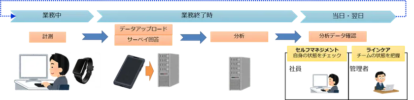 本サービスを業務中にご利用するなかで心身の情報を計測し、また業務終了後に分析するといった「ご利用サイクル」のなかで、企業は社員の状態やモチベーションの変化を具体的に把握し、セルフマネジメントやラインケアなどにより社員に対して適切なサポートを行い、社員のエンゲージメント向上につなげることができます。