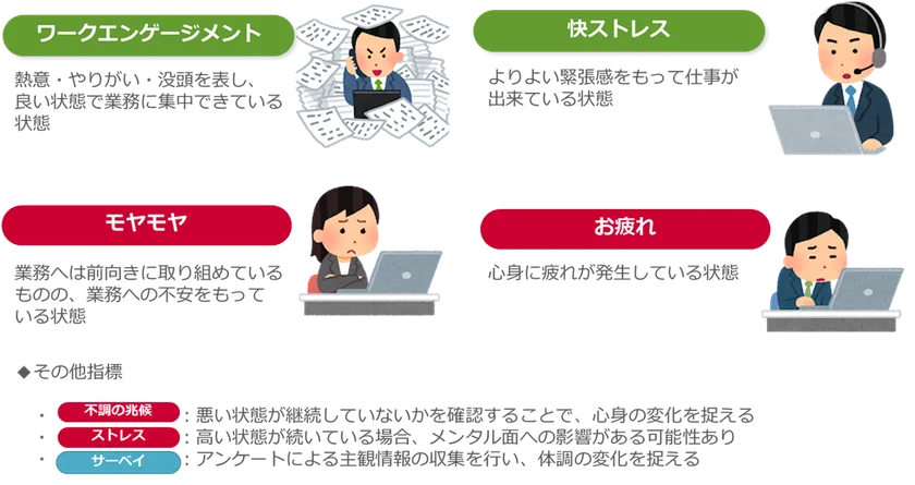 今回受賞対象となった「みまもりがじゅ丸(R)オフィスプラスプラン」は、リストバンド型バイタルセンサーを活用することで、心身の情報を数値化することができます。「見える化指標」として「モヤモヤ」や「お疲れ」といったストレス状態などのマイナス面のみではなく、「ワークエンゲージメント」や「快ストレス」のプラス面も把握できます。
